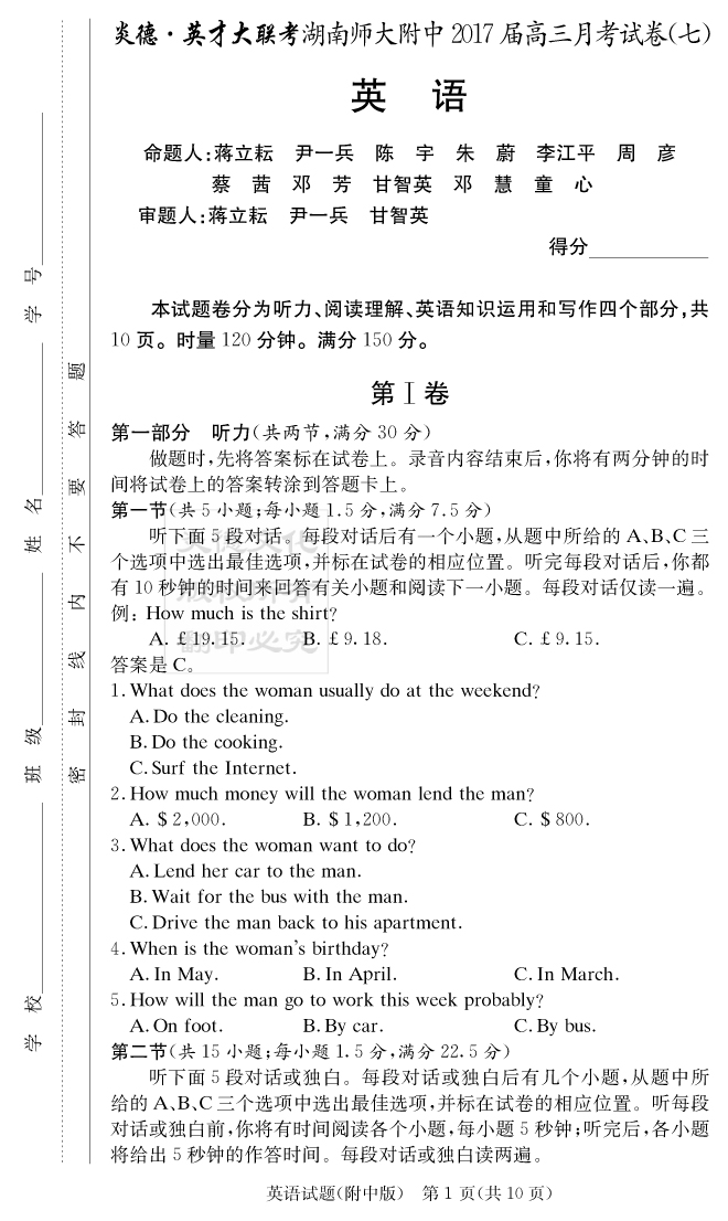 【英語】炎德英才大聯(lián)考2017師大附中高三7次月考
