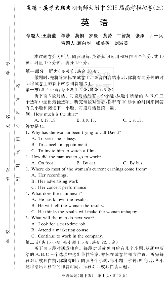 【英語】炎德英才大聯考2018師大附中高三10次月考(模擬三)