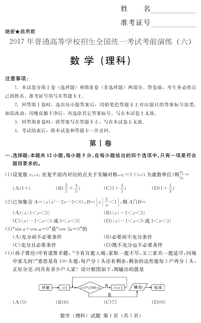 【理數】2017年普通高等學校招生全國統一考試考前演練(六)