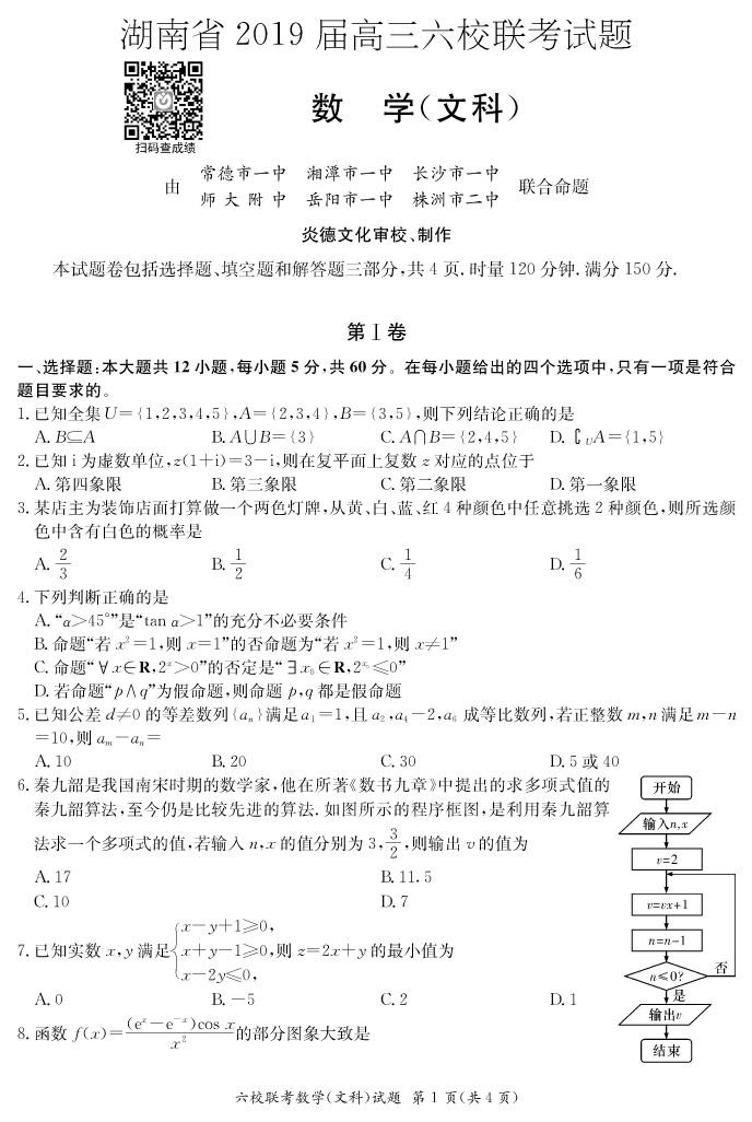 【文數】湖南省2019屆高三六校聯考