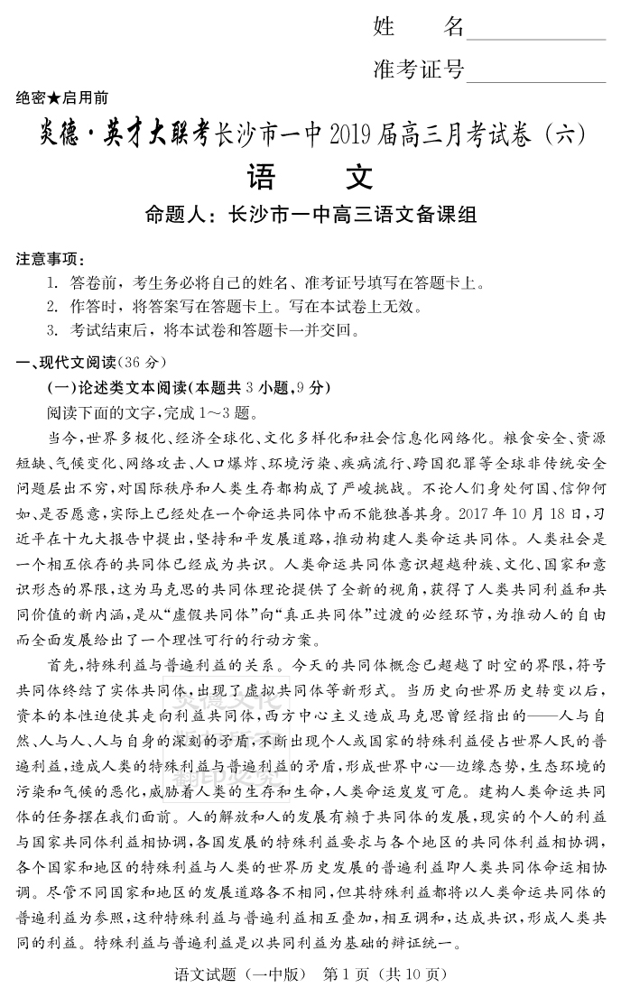 【語文】炎德英才大聯考2019長沙一中高三6次月考