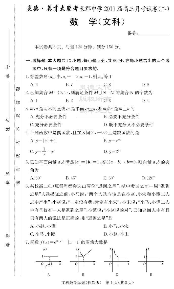 【文數(shù)】炎德英才大聯(lián)考2019長郡中學(xué)高三2次月考