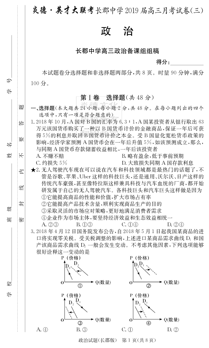 【政治】炎德英才大聯考2019長郡中學高三3次月考