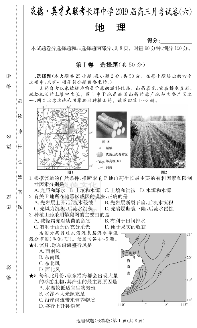 【地理】炎德英才大聯考2019長郡中學高三6次月考