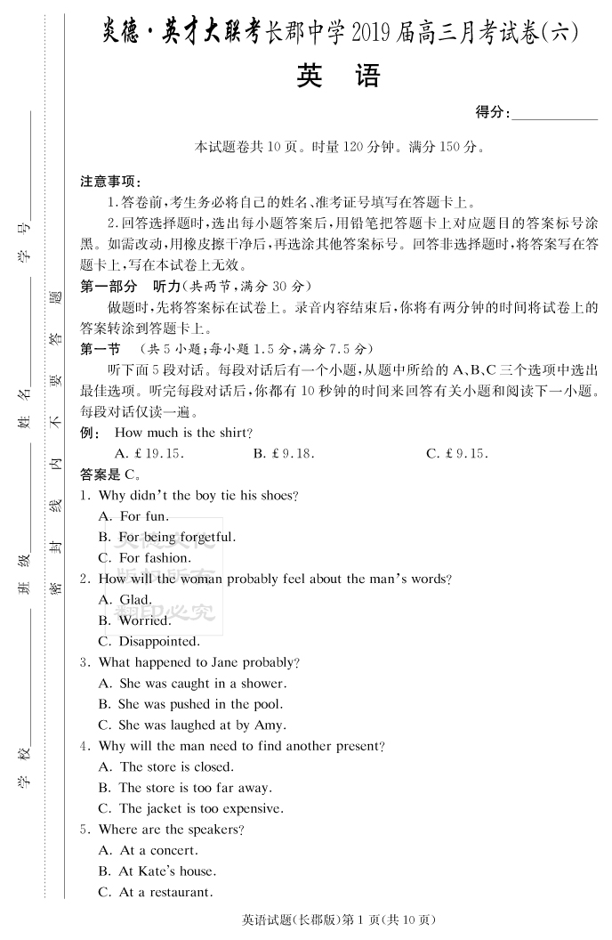 【英語】炎德英才大聯(lián)考2019長郡中學高三6次月考