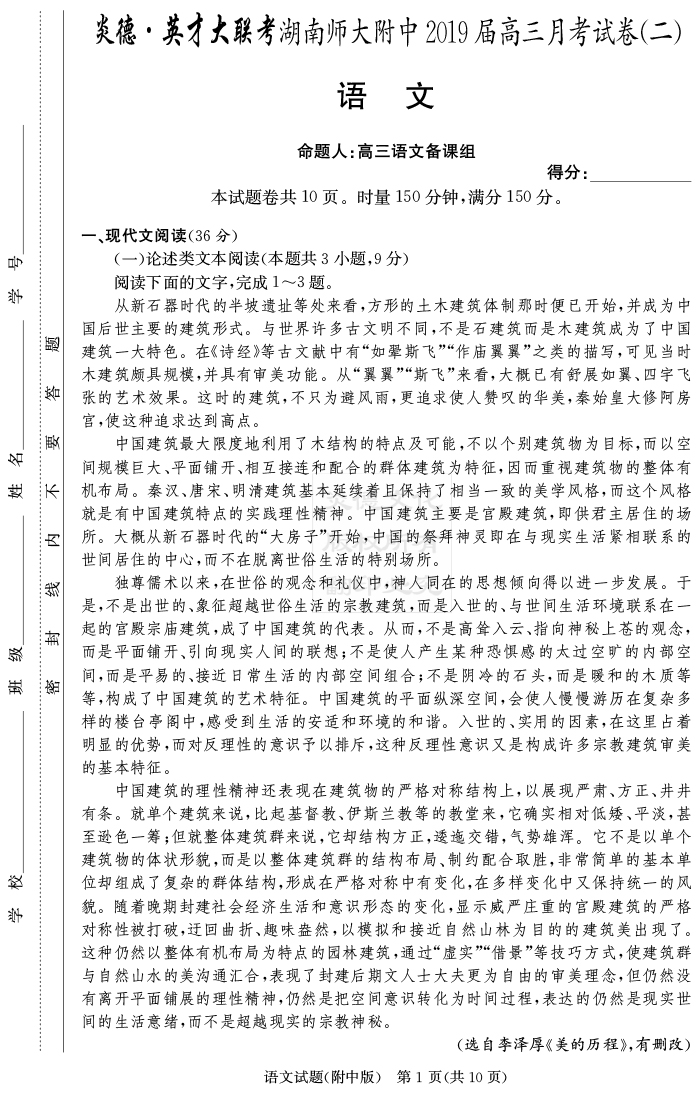 【語文】炎德英才大聯考2019師大附中高三2次月考