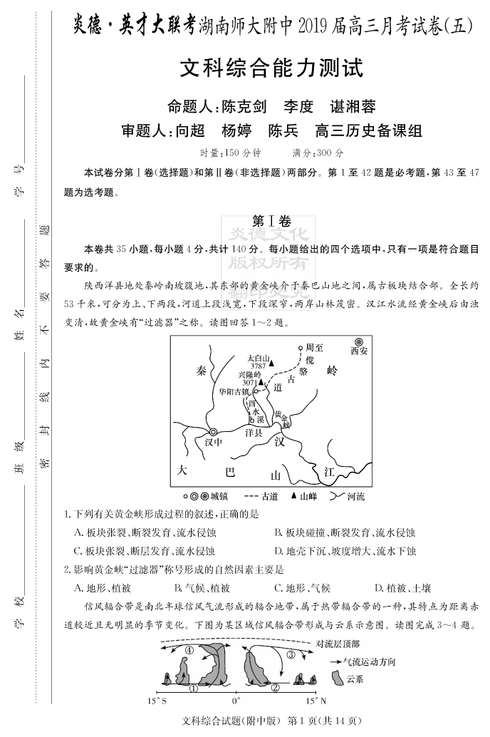 【文綜】炎德英才大聯考2019師大附中高三5次月考