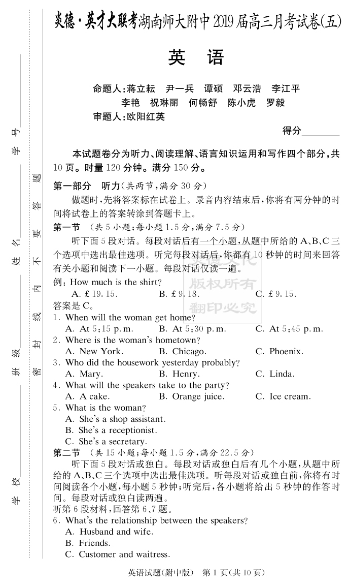 【英語】炎德英才大聯考2019師大附中高三5次月考