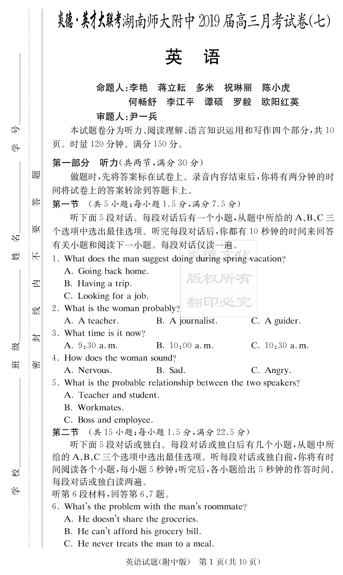 【英語】炎德英才大聯考2019師大附中高三7次月考