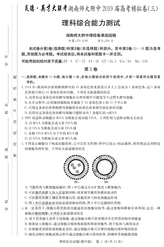 【理綜】炎德英才大聯考2019師大附中高三10次月考(模擬三)