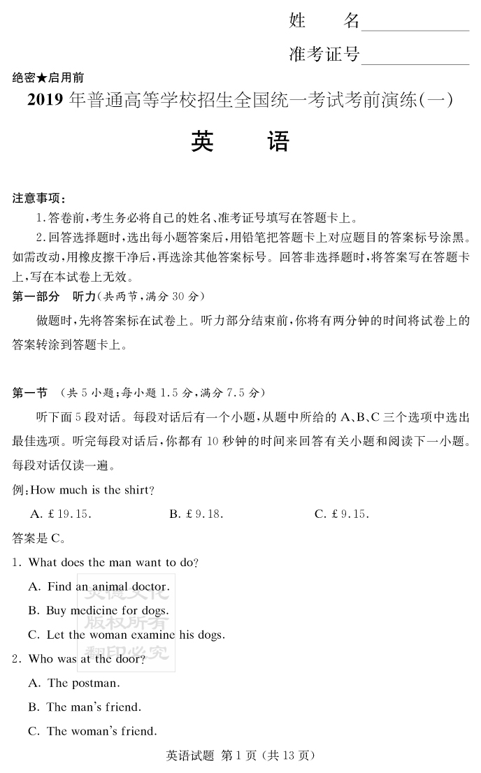 【英語】2019年普通高等學(xué)校招生全國統(tǒng)一考試考前演練(一)