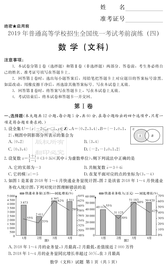 【文數(shù)】2019年普通高等學(xué)校招生全國(guó)統(tǒng)一考試考前演練(四)