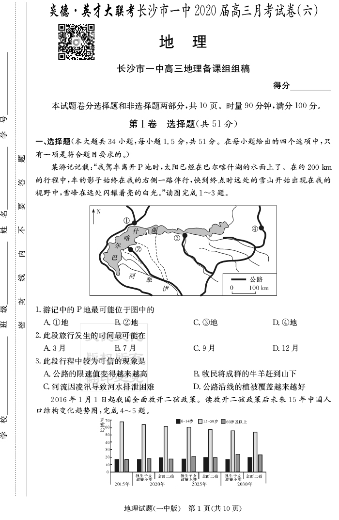 【地理】炎德英才大聯考2020屆長沙市一中高三6次月考