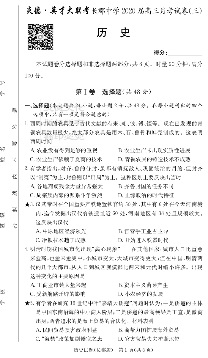 【歷史】炎德英才大聯考2020屆長郡中學高三3次月考