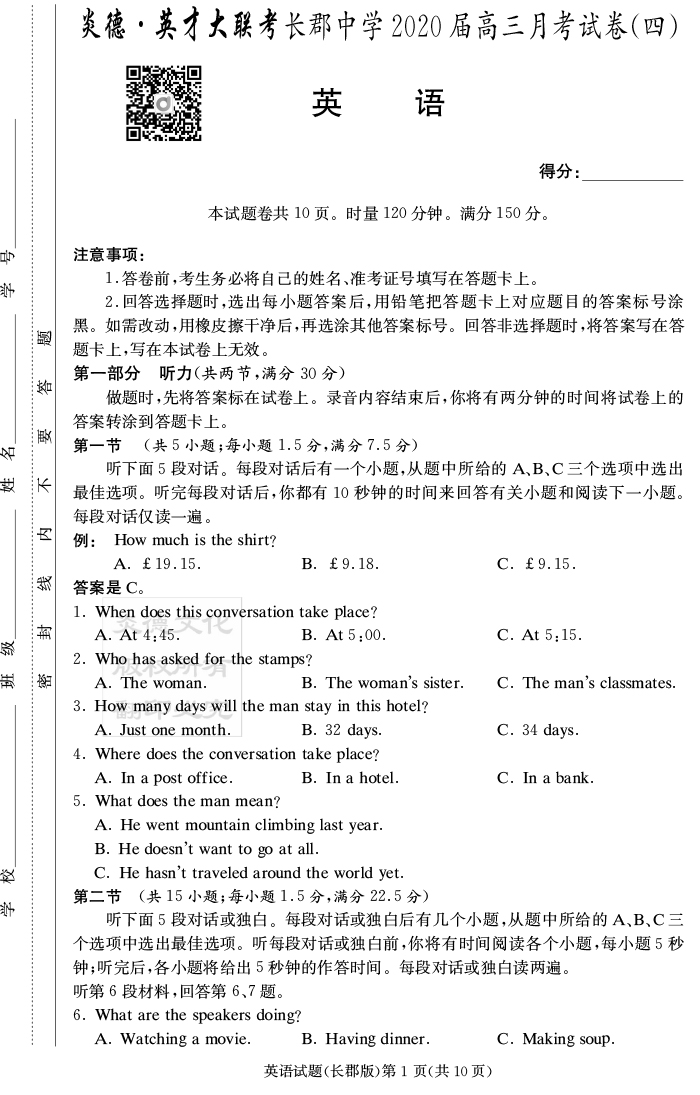 【英語】炎德英才大聯(lián)考2020屆長郡中學(xué)高三4次月考