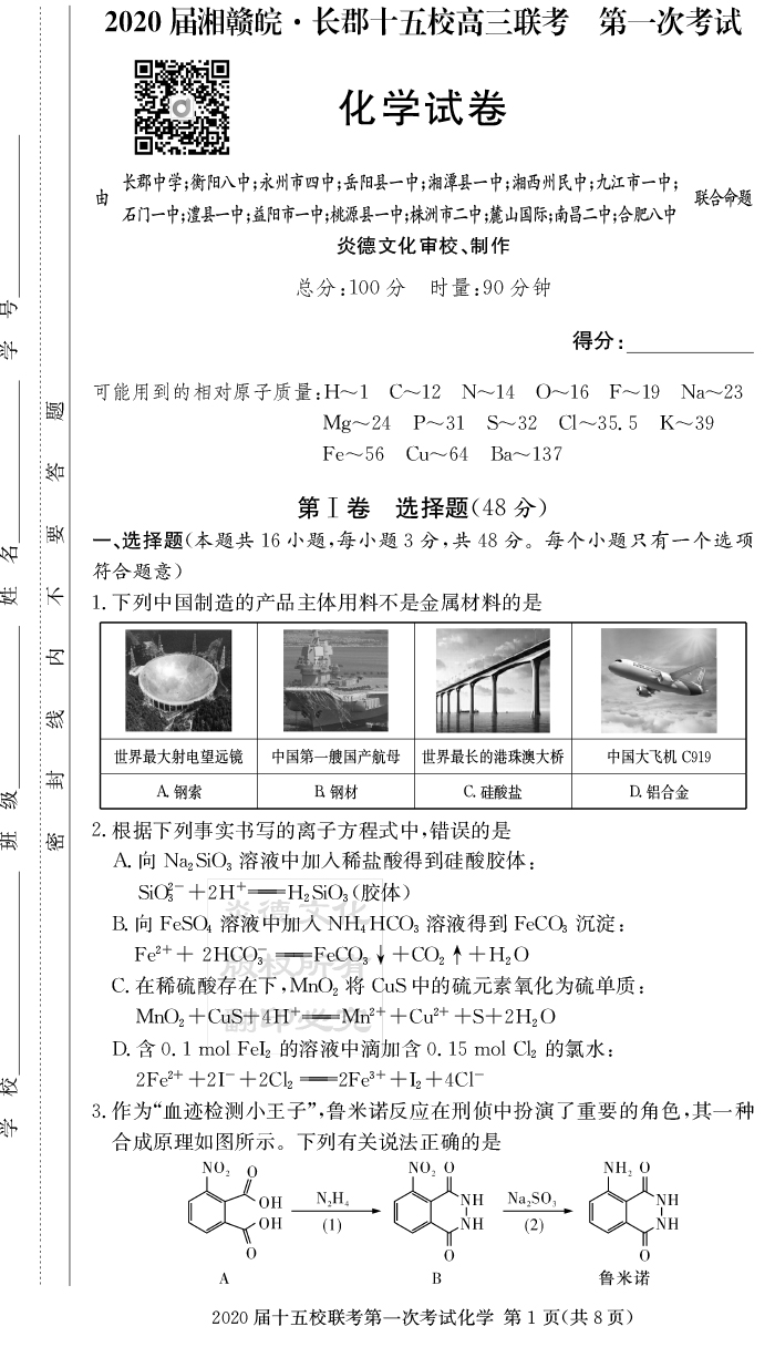 【化學】炎德英才大聯考2020屆長郡中學高三7次月考(十五校聯考一)