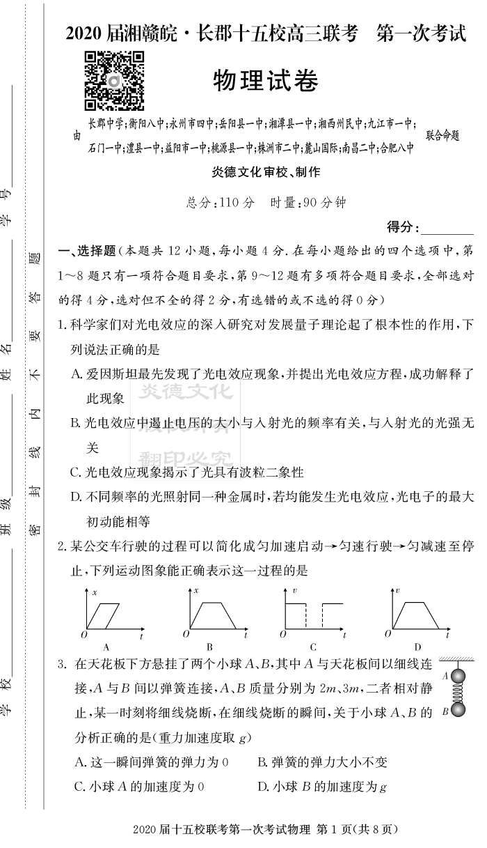 【物理】炎德英才大聯考2020屆長郡中學高三7次月考(十五校聯考一)