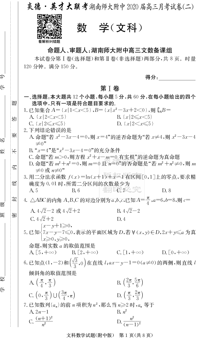 【文數】炎德英才大聯考2020屆師大附中高三2次月考