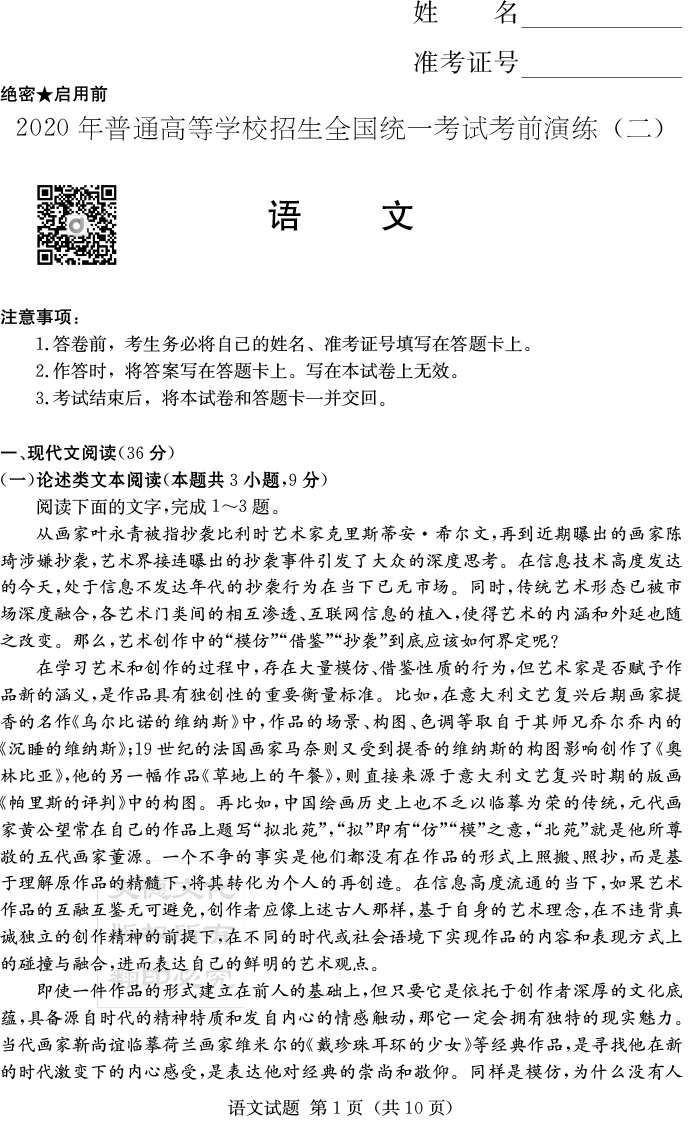 【語文】2020年普通高等學校招生全國統一考試考前演練(二)