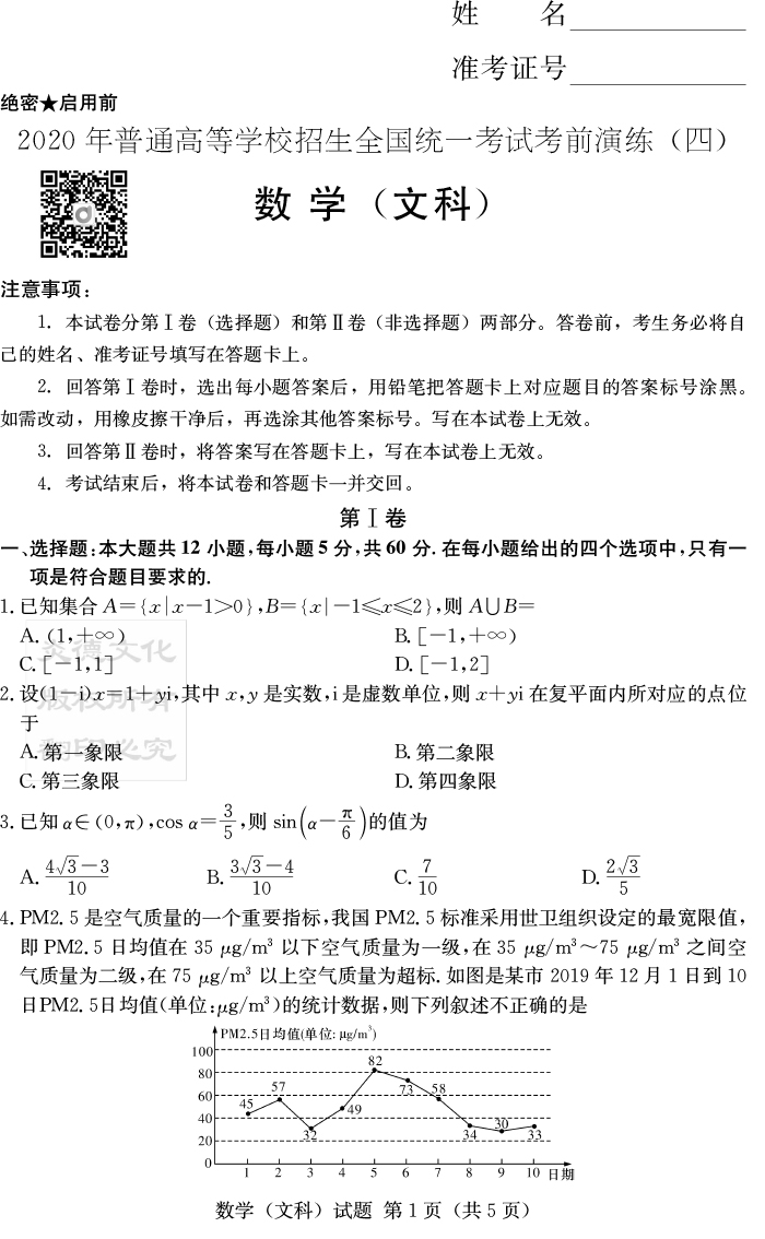 【文數】2020年普通高等學校招生全國統一考試考前演練(四)