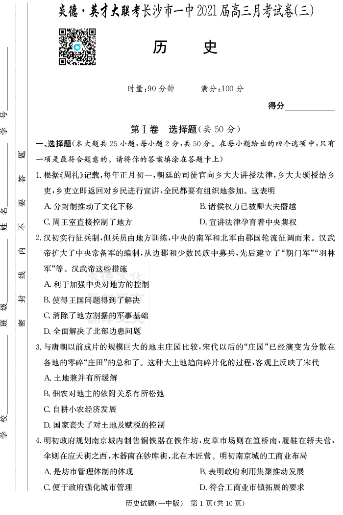 【歷史】炎德英才大聯考2021屆長沙市一中高三3次月考
