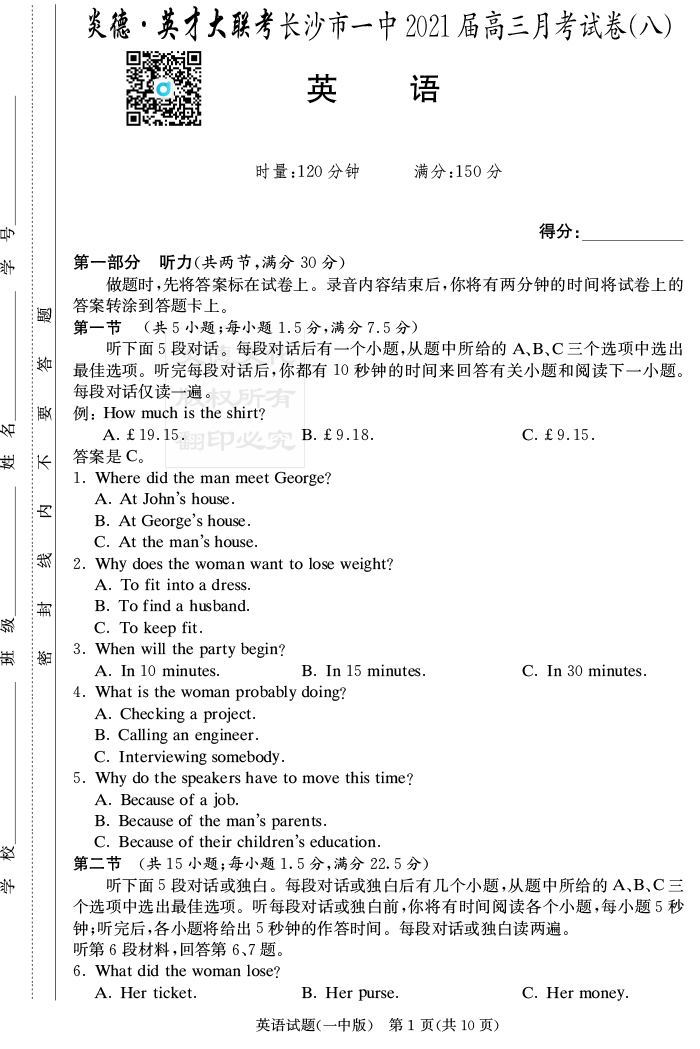 【英語】炎德英才大聯(lián)考2021屆長(zhǎng)沙市一中高三8次月考