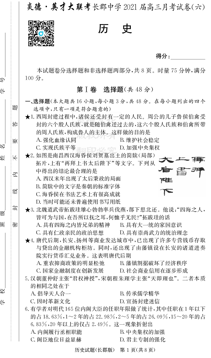 【歷史】炎德英才大聯(lián)考2021屆長郡中學(xué)高三6次月考