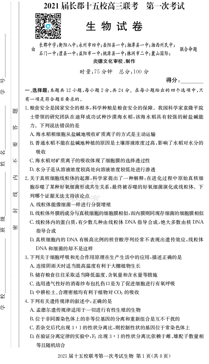 【生物】炎德英才大聯考2021屆長郡中學高三7次月考(十五校聯考一)