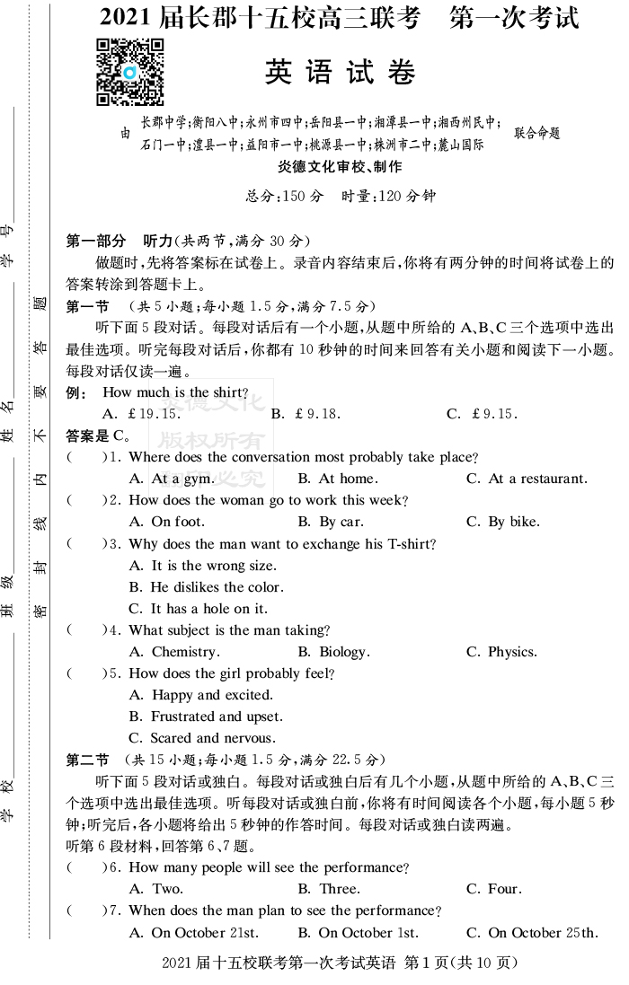 【英語】炎德英才大聯考2021屆長郡中學高三7次月考(十五校聯考一)