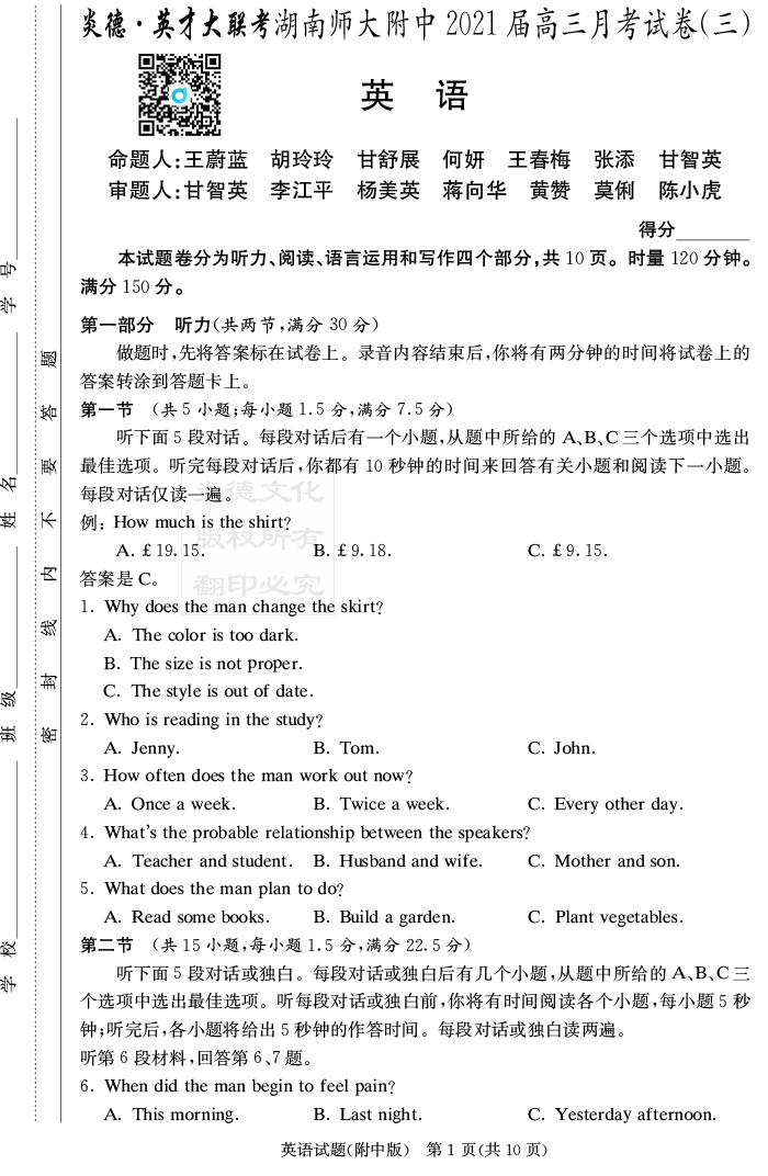 【英語】炎德英才大聯考2021屆湖南師大附中高三3次月考