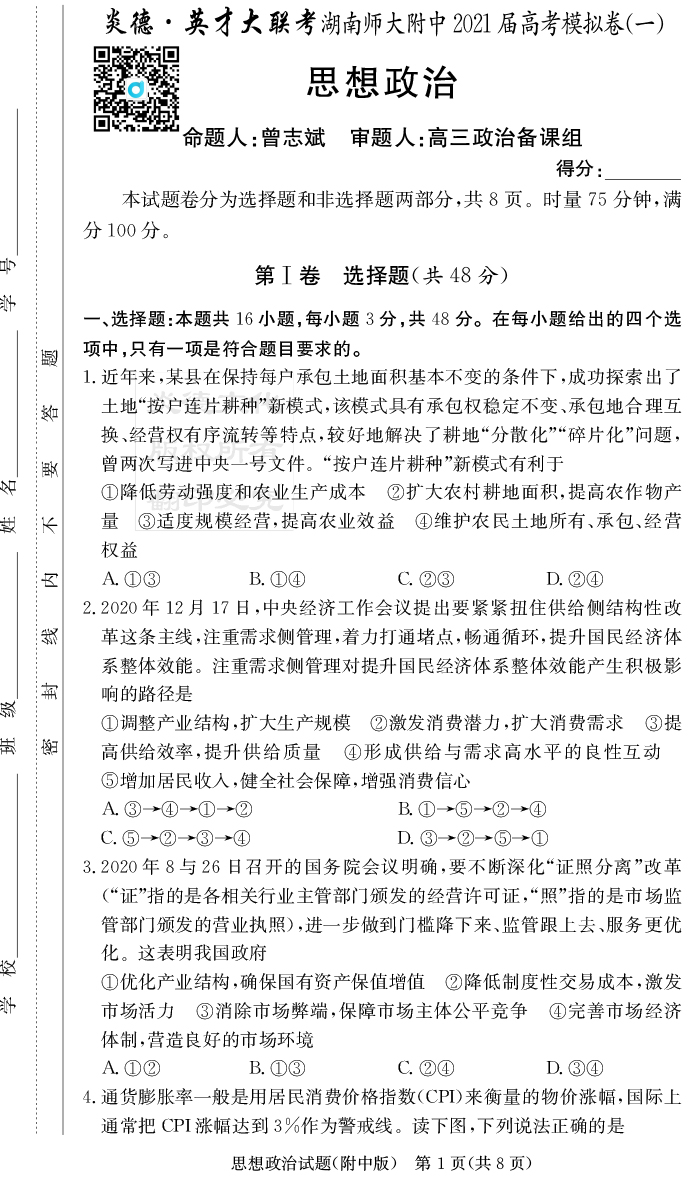 【政治】炎德英才大聯考2021屆湖南師大附中高三8次月考(模擬一)
