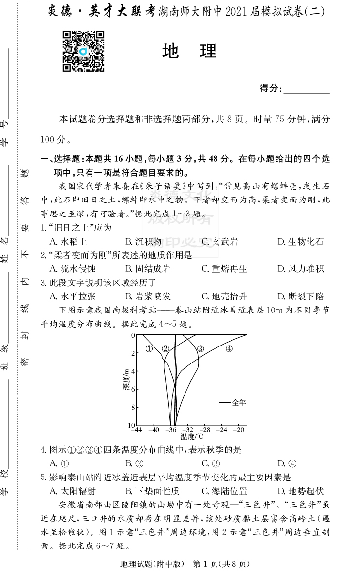 【地理】炎德英才大聯考2021屆湖南師大附中高三9次月考(模擬二)