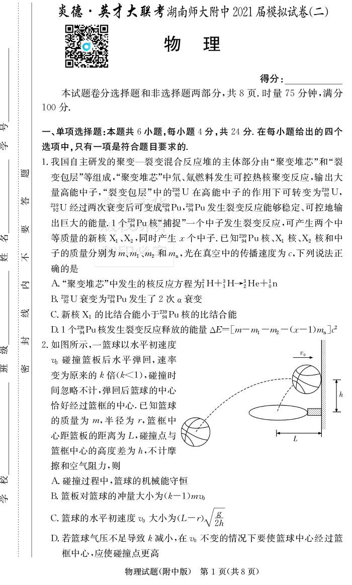【物理】炎德英才大聯考2021屆湖南師大附中高三9次月考(模擬二)
