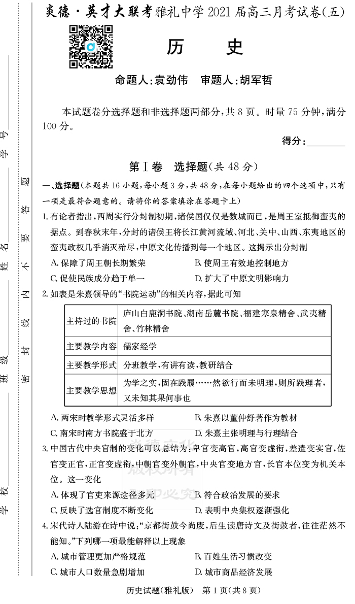 【歷史】炎德英才大聯考2021屆雅禮中學高三5次月考