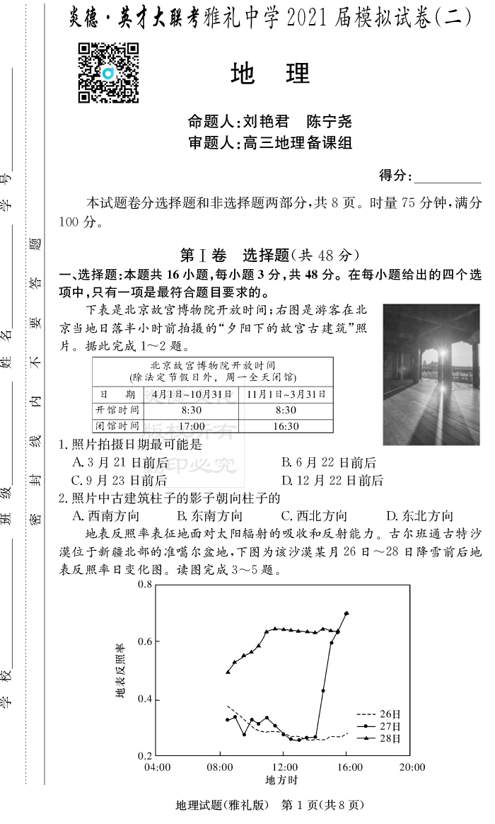 【地理】炎德英才大聯(lián)考2021屆雅禮中學(xué)高三10次月考(模擬二)