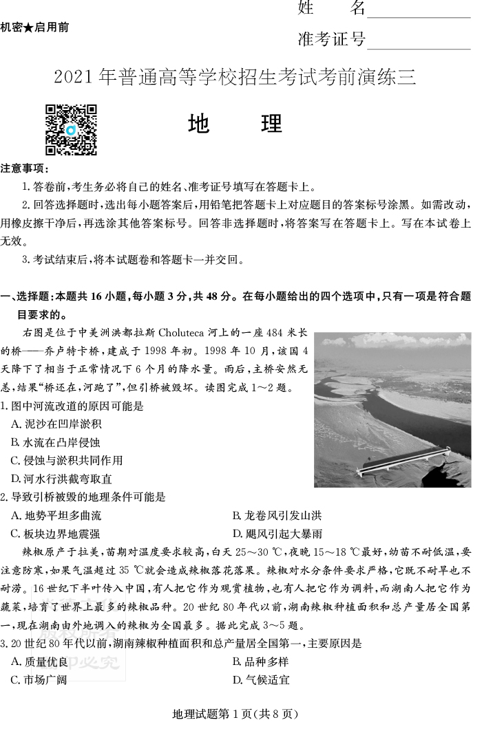 【地理】2021年普通高等學校招生全國統一考試考前演練(三)