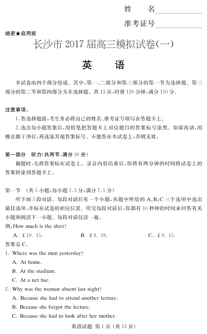 【英語】長沙市2017屆高三模擬考試(一)