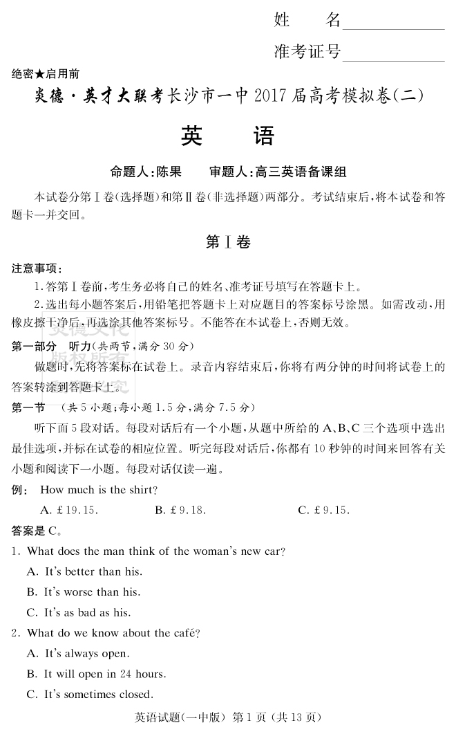 【英語】炎德英才大聯(lián)考2017長沙一中高三11次月考(模擬二)