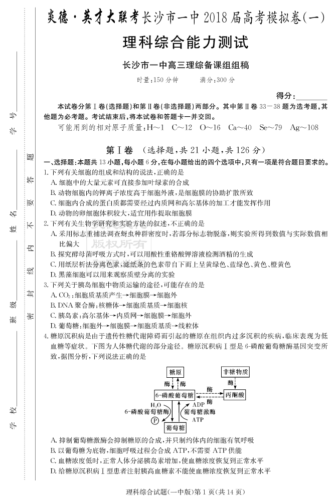 【理綜】炎德英才大聯考2018長沙一中高三10次月考(模擬一)